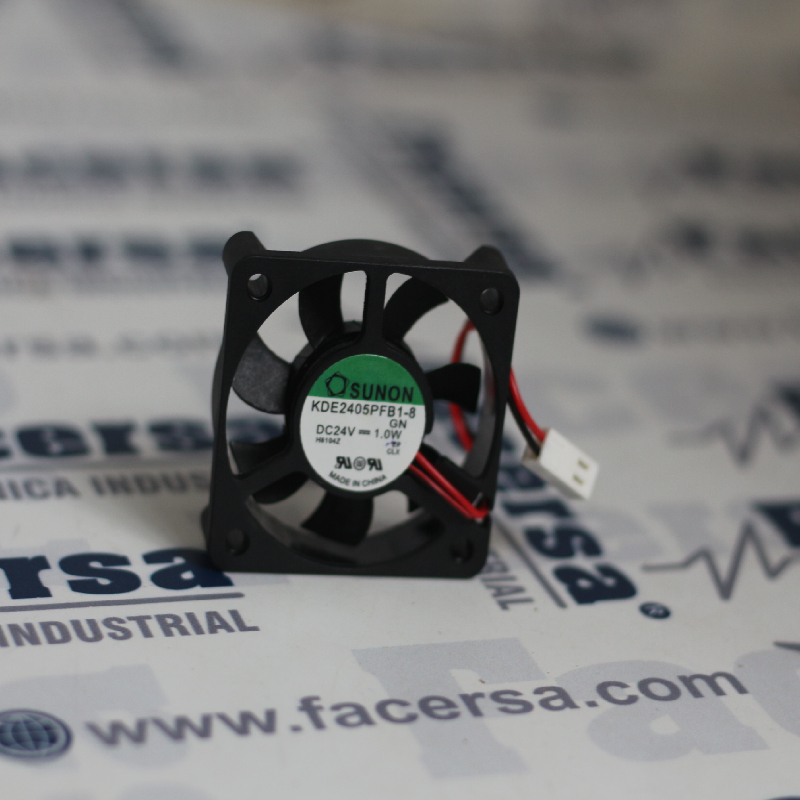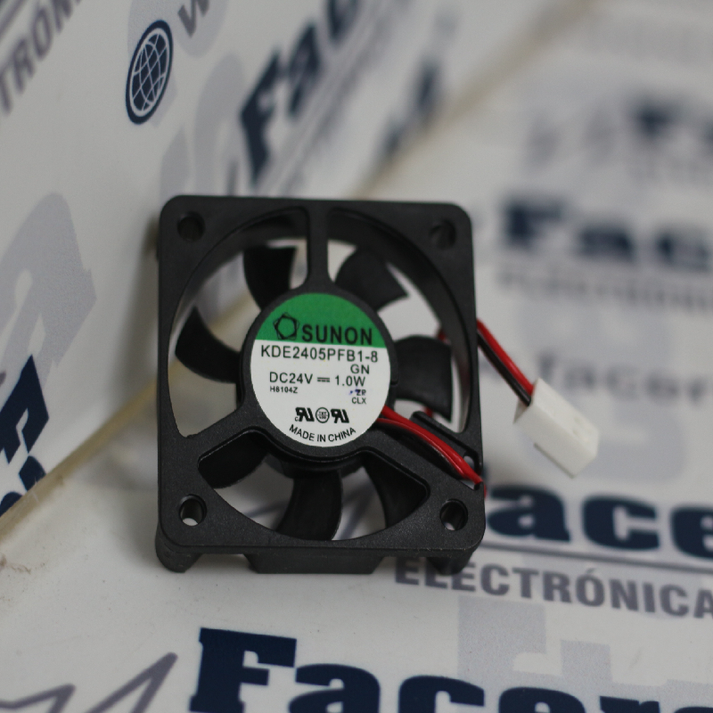 Marca: Sunon. Modelo: KDE2405PFB1-8. Tamaño: 50x50x10mm Voltaje: 24 V DC. Potencia: 1,0 W. Rodamiento: rodamiento de bolas dual. Líder: 2 líneas.